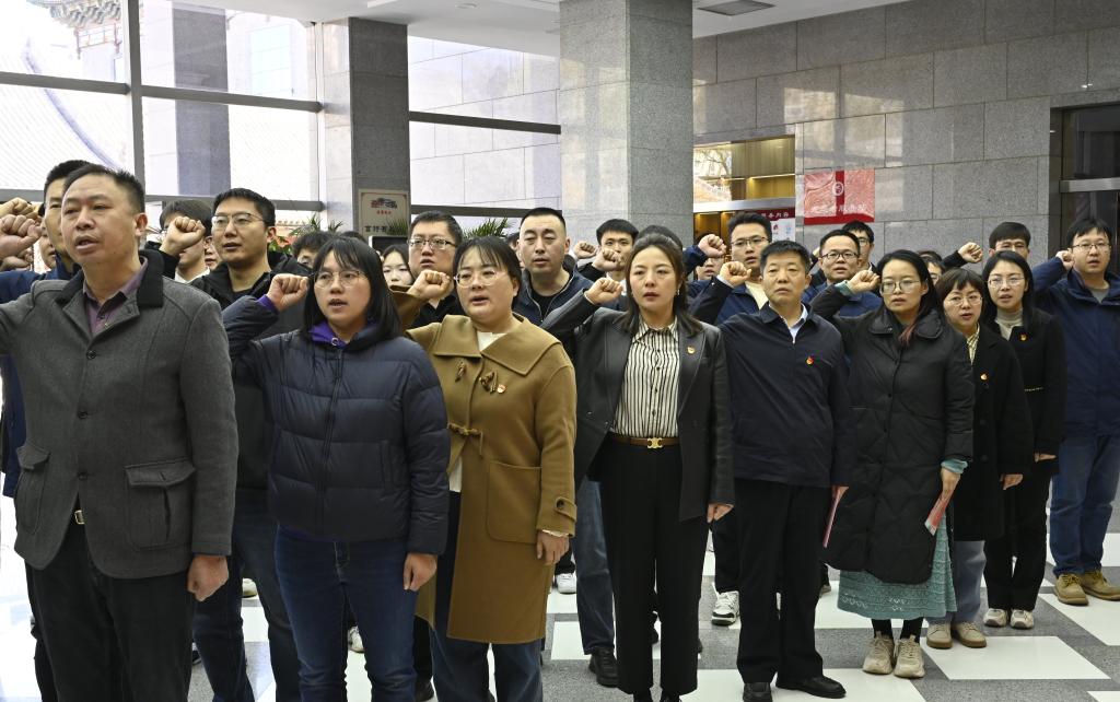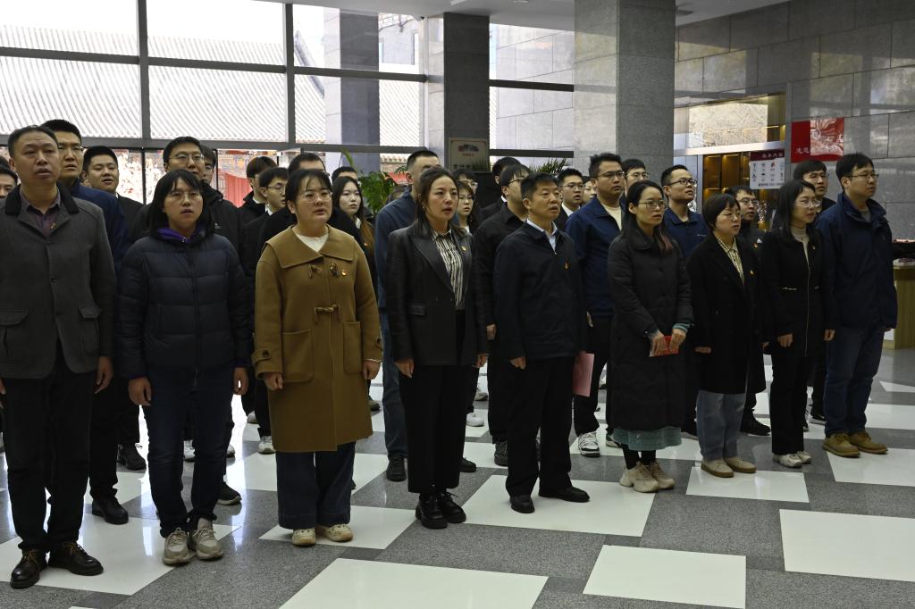 在中共太原支部成立旧址前,全体党员重温入党誓词。师生面向党旗庄严宣誓,铮铮誓言回荡在革命圣地,彰显了新时代党员的责任与担当。