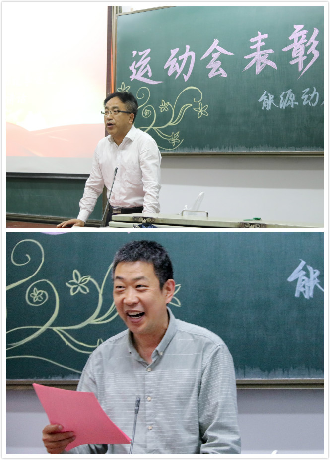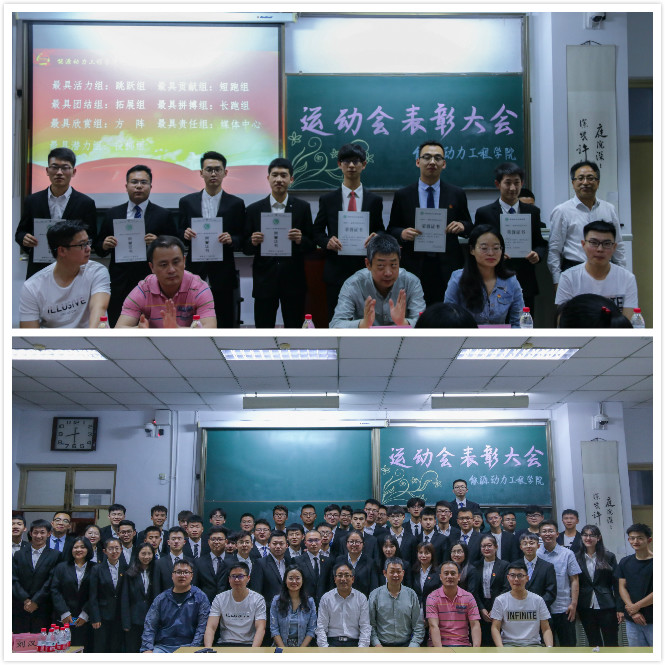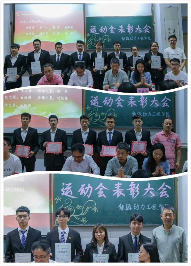 同学们在本届运动会中的出色表现,能源动力工程学院于5月28日下午七点半在11212教室举行运动会表彰大会。出席本次大会的嘉宾有院党委书记李运芝、院长刘汉涛、学生科科长叶增民、院团委书记李晓彧、学生科辅导员乔洋,研究生辅导员杨勇和唐金保。全体运动员,后备工作人员以及学院团委学生会干部参与了本次大会。