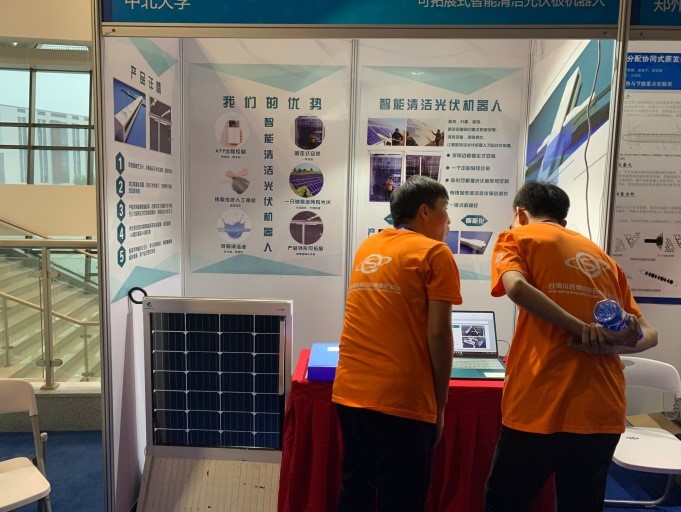 《可拓展式智能清洁光伏板机器人》参赛项目针对目前光伏板清洁慢、贵、效果差且浪费水资源的问题,设计研发了新一代可拓展式智能清洁光伏机器人,用以彻底解决光伏板清洁速率慢、效果差、耗能高的问题,相比传统工艺节省了成本、降低了能耗。作品得到了评委、参赛师生及参展观众的一致好评,最终凭借优异表现喜获佳绩。