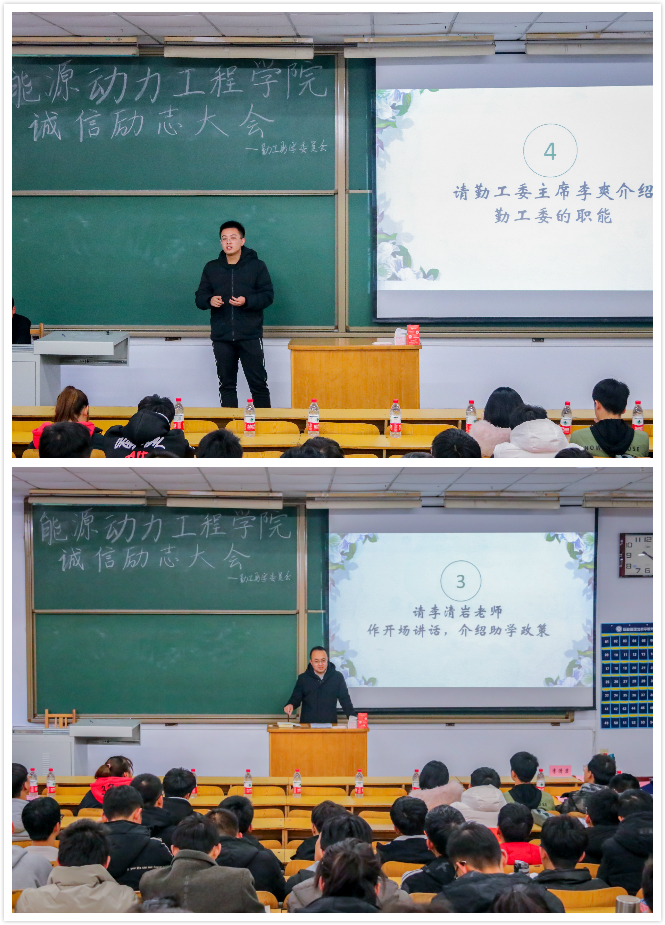 为引导家庭经济困难学生健康成长和成才,能源动力工程学院于12月10日下午16:00在08101教室举办了诚信励志大会。出席本次大会的嘉宾有学生科李清岩老师和其他各院代表。