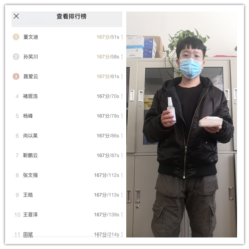 知识竞答内容涵盖疫情防控期间的学生管理相关规定、外出审批办法、学习生活服务安排、新冠肺炎防控知识等等。竞答从4月19日开始,持续进行了2天。竞答结束后,对答题准确且用时最短的前30名同学发放酒精消毒液、消毒湿巾等防疫物资作为奖品,倡导大家做好防护,健康生活。