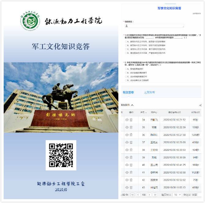 “军工文化月”,为强化军工文化主题教育,浓郁学院军工文化氛围,传承“人民兵工第一校”的红色基因,能源动力工程学院工会举办“弘扬军工文化,传承红色基因”网络知识竞答,号召广大教职工秉承太行精神,践行致知于行,铸魂固本、立德树人。全院61名教职工通过在线答题的方式参加了此次知识竞答活动。