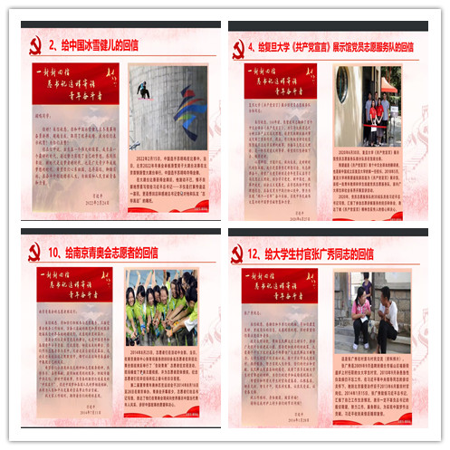 也为中国航天事业做出了突出贡献,助力“神十四”出征,大家要努力学习,为航天强国再立新功;读到给南开大学8名新入伍大学生的回信时指出,作为人民兵工第一校的学子,大家要献身国防和军队建设,到军营这个大熔炉里淬炼成钢;读到给大学生村官张广秀同志的回信时指出,毕业生要扎根基层,在创新创业中增长智慧才干,在艰苦奋斗中锤炼意志品质。作为大学生党员,更要勇于在党和国家最需要的地方绽放绚丽之花,奉献青春力量。