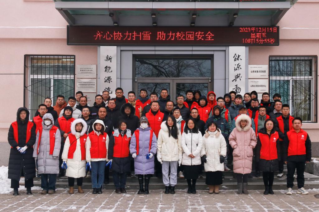 学院党员领导干部带头,60余名师生在院楼门口集合,吹响清雪除冰的冲锋号。早晨室外的温度已低至零下11度,再加上呼啸的寒风,天气异常寒冷。但大家不畏严寒,身着红色志愿者马甲,手持扫帚、铁锹等工具,全力投入到扫雪工作中。他们用扫帚将积雪扫开,然后用铁锹将冰块和雪块铲除,白雪皑皑中的“一抹红”构成了这个冬日雪景中最亮丽的风景线,筑起了一道校园安全的红色防线。大家面对强降雪带来的挑战,以高效的协作,全力以赴地完成了任务,为师生清扫出一条“出行安全路”。