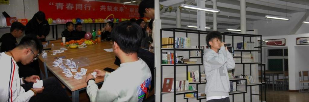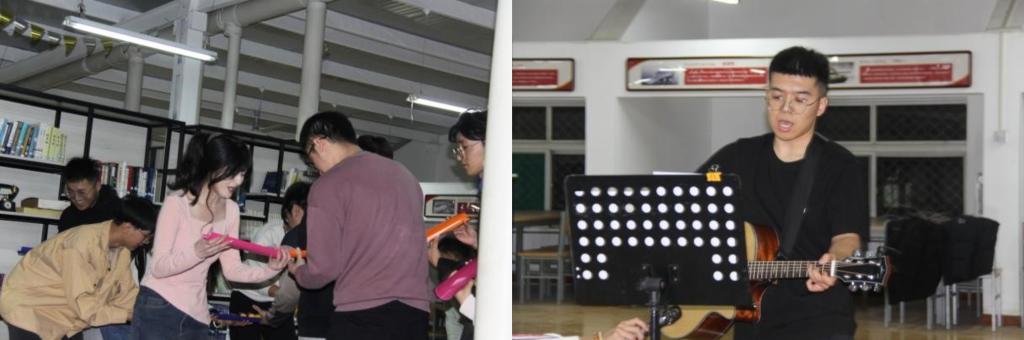 研究生提供一个展现自我、结识好友的平台。活动开始后首先由陈亮、王松两位同学的《只想把你偷偷藏好》歌曲以男女对唱的形式完成热场环节;随后,活动进入了“谁是卧底”、“心情积木”等游戏环节,过程中充分展现了活动的互动性、趣味性以及同学们的参与积极性和团队合作精神。期间,穿插了陈亮同学的《看月亮爬上来》等歌曲独唱节目,营造了活动的轻松欢快氛围,最后活动在赵晨阳和宋涛的吉他弹唱曲目《New Boy》中画上圆满句号,充分体现青年一代的蓬勃朝气和对未来的憧憬向往,同时也呼应了联谊活动的青春主题。